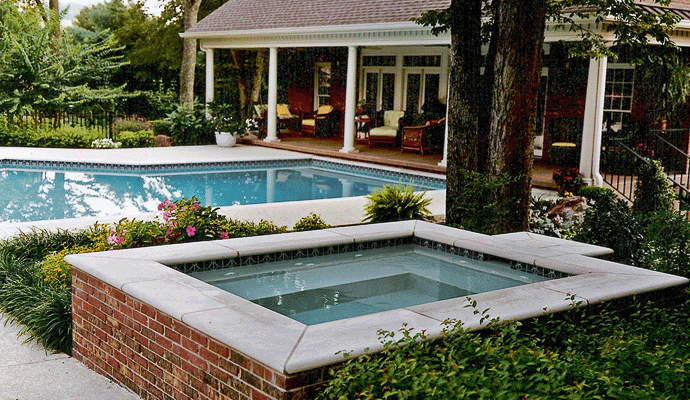 A simple classical Georgian poolhouse/exercise room tucked into a tight backyard, integrated with the landscape.