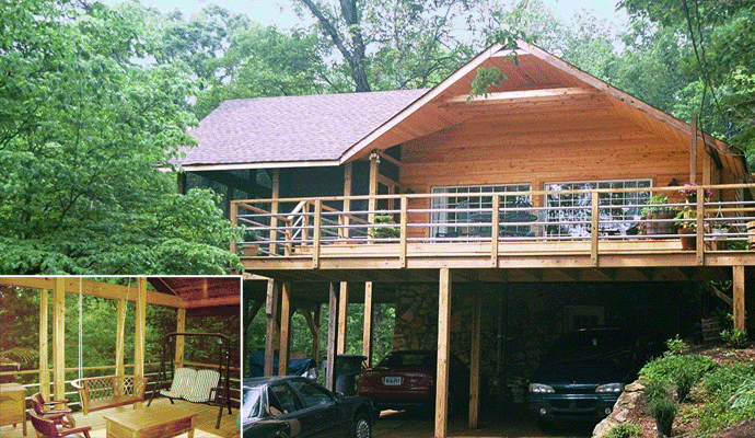 A deck/carport and a screened porch in the treetops for a contemporary home on a steep site.
